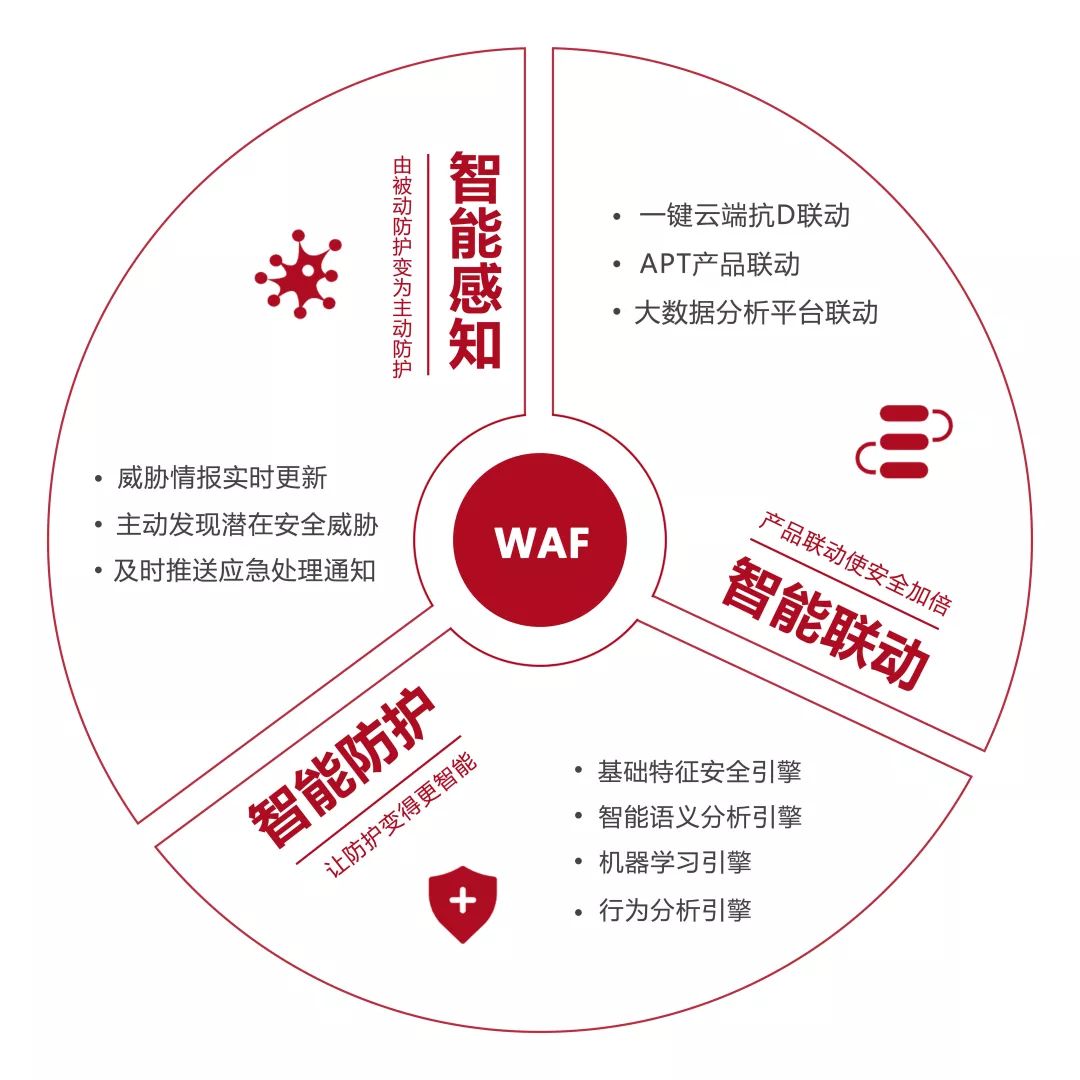 新一代智能WAF通过与“云端抗D中心”、“APT”、“大数据分析平台”的智能联动,弥补了单台WAF安全防护的局限性,实现对可疑、未知的攻击行为检测,对为客户提供更加全面的Web应用安全解决方案。