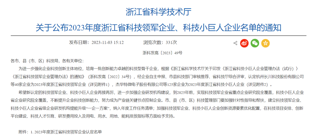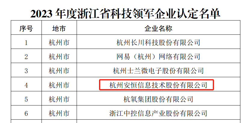 为进一步强化企业科技创新主体地位,培育一批创新能力卓越的科技型骨干企业,近日,浙江省科学技术厅正式公布 2023 年度浙江省科技领军企业及科技小巨人企业名单名单,安恒信息获选2023 年度浙江省科技领军企业。