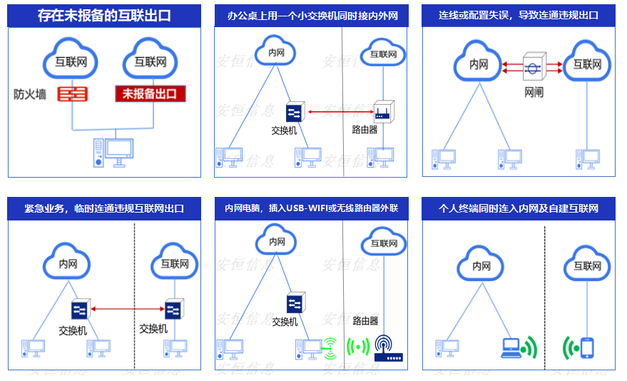 当前,大数据管理局作为推动智慧城市建设和政府数字化转型的核心力量,肩负着统筹推进电子政务基础设施建设和安全管理的重任。然而,在电子政务外网的实际运营中,仍存在严重的违规外联安全挑战。违规外联的典型方式如下: