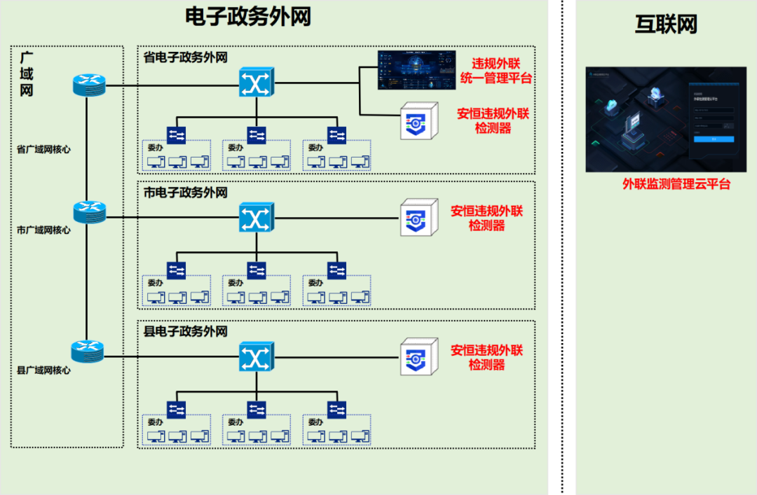 用户需在省电子政务外网部署违规外联统一管理平台和安恒违规外联检测器,市电子政务外网部署安恒违规外联检测器,县电子政务外网部署安恒违规外联检测器;在互联网侧部署外联监测管理云平台,形成三级联动的监管体系。以下是具体的架构图: