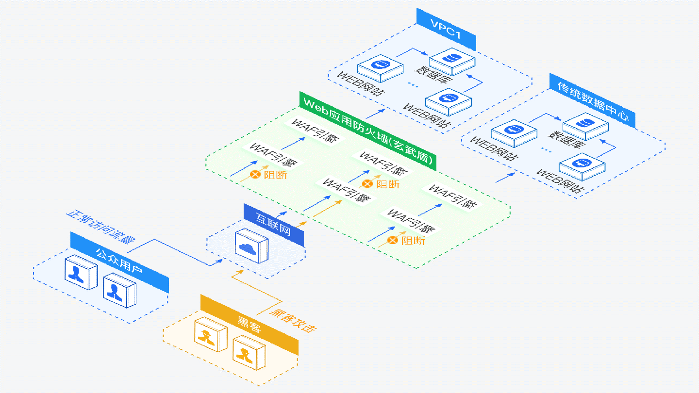 云Web应用防火墙精准覆盖各类Web应用攻击,为客户识别恶意请求,防御未知威胁,