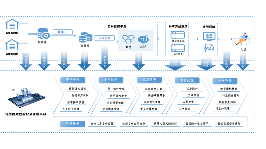 通过主动扫描、流量分析、人工检测相结合的方式,对业务系统和接口、数据库、大数据平台进行发现和管理,建立数据资产管理;根据数据特征和数据样本建立的敏感数据识别模型和分类分级规则,对存储的敏感数据进行发现识别和自动分类分级,摸清敏感数据资产分布。