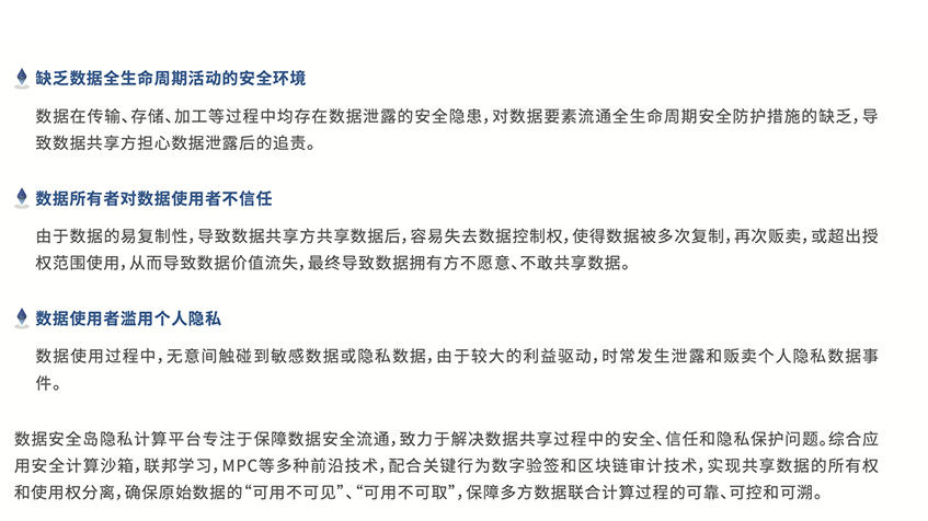 由于敏感数据时常发生数据泄露和缺乏有效的安全保障手段,导致数据拥有方都不愿开放和共享数据。究其原因既有缺乏相关法律法规导致的责任认定不清的问题,也有数据安全共享技术的缺失制约了政府部门及企业间数据的开放共享。制约数据要素流通的主要挑战表现为以下三点: -