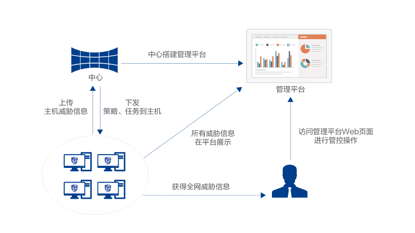 服务器、PC和虚拟机等终端安装了客户端软件后,上传病毒木马、违规外联、安全配置等威胁信息到管理控制中心。用户在管理控制中心可以看到所有安装了客户端软件的主机的安全态势以及通过情报云脑对威胁风险进行动静态分析,并进行统一任务下发,策略配置。