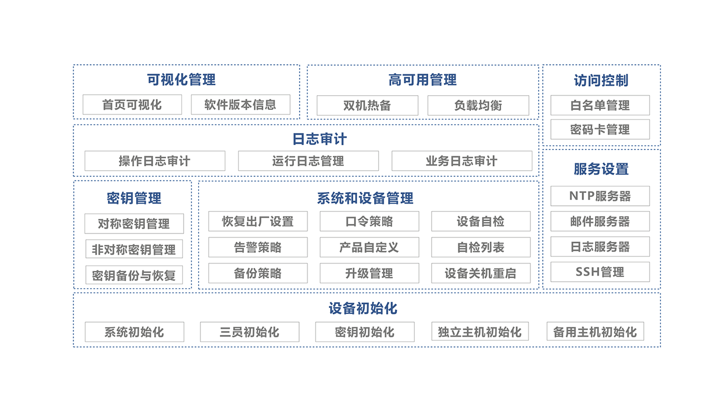 以现代密码技术为核心,为信息安全系统提供包括数据加解密、数字签名与验签、密钥管理、消息验证等密码服务,满足业务交易对数据从产生、传输、处理、存储过程中的机密性、完整性、不可抵赖性以及身份认证的要求,同时提供安全、完善的密钥管理机制,为信息系统的数据安全提供有力保障。